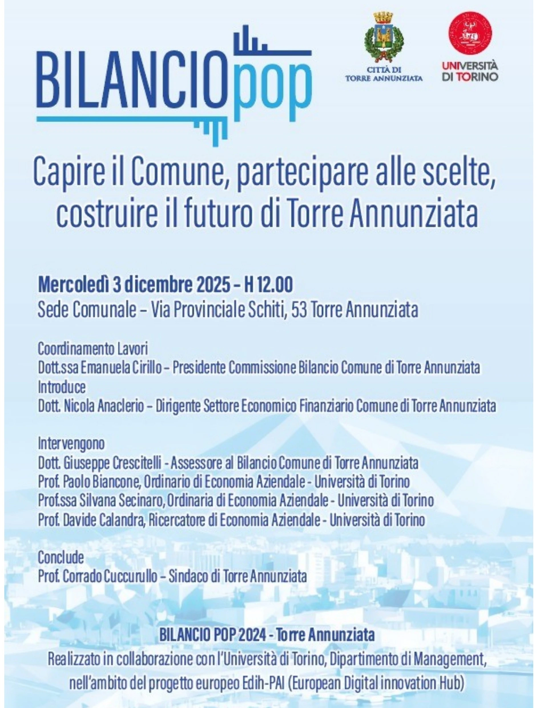 Il giorno 3 dicembre alle ore 12:00 presso la sede comunale si terrà l'incontro dal titolo "Bilancio Pop - Capire il Comune, partecipare alle scelte, costruire il futuro di Torre Annunziata", progetto in collaborazione con l'Università di Torino, Dipartimento di Management, nell'ambito del progetto europeo Edih-PAI (European Digital Innovation Hub). Per tutti i dettagli si consulti la locandina.